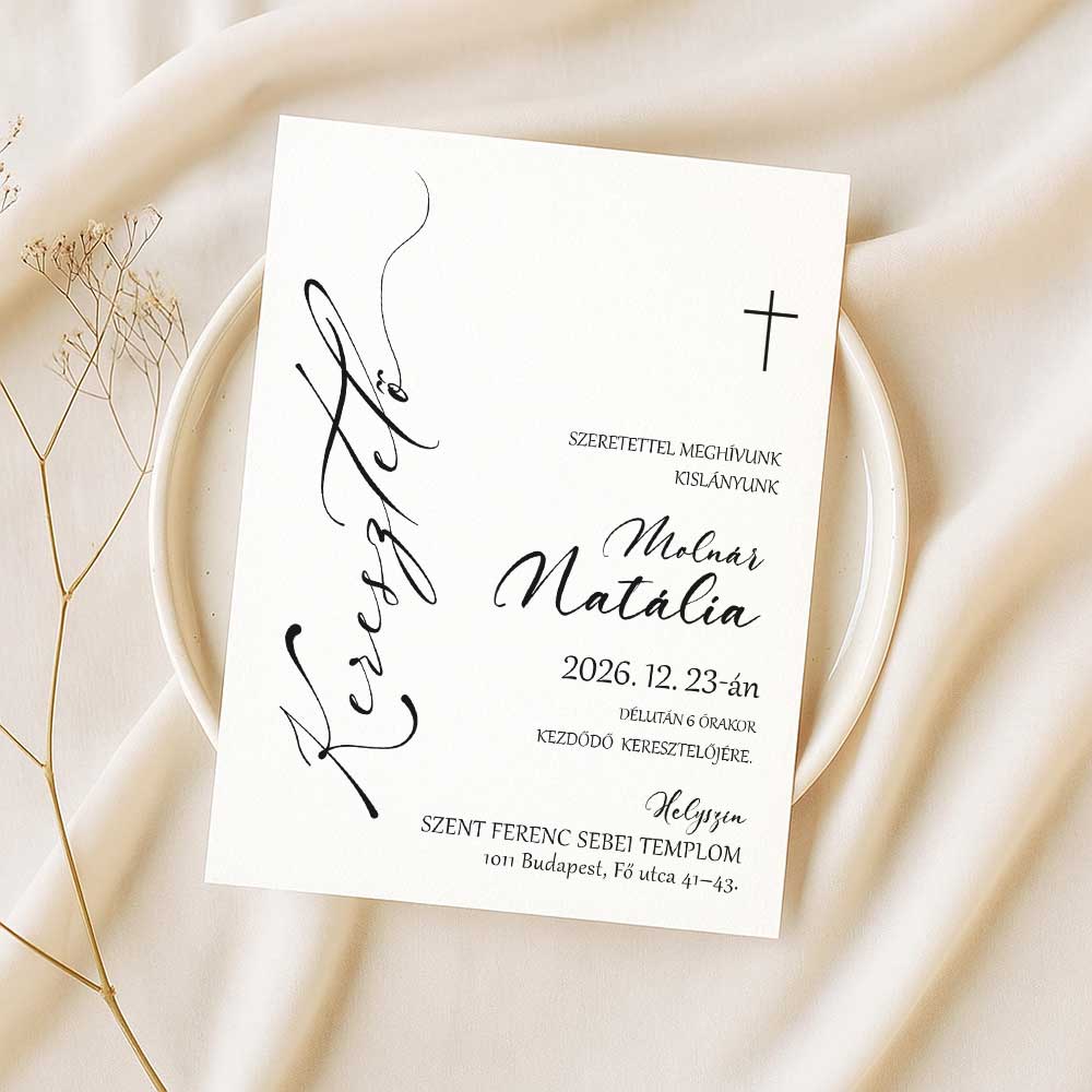 Letisztult és modern keresztelő meghívó elegáns tipográfiával. A visszafogott dizájn időtlen választás, amely a minimalizmus szépségét hangsúlyozza. Tökéletes mind fiús, mind lányos keresztelőre, egyszerre egyszerű, ízléses és személyre szabható, hogy illeszkedjen az esemény hangulatához.