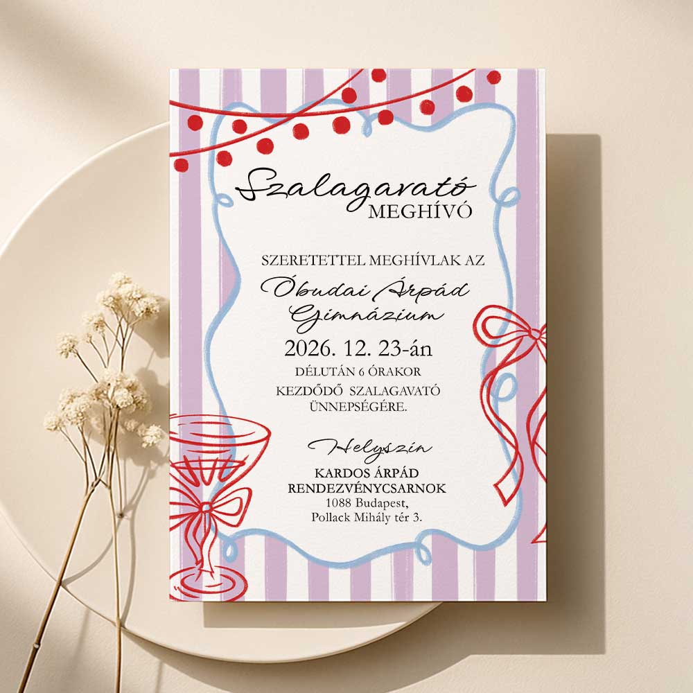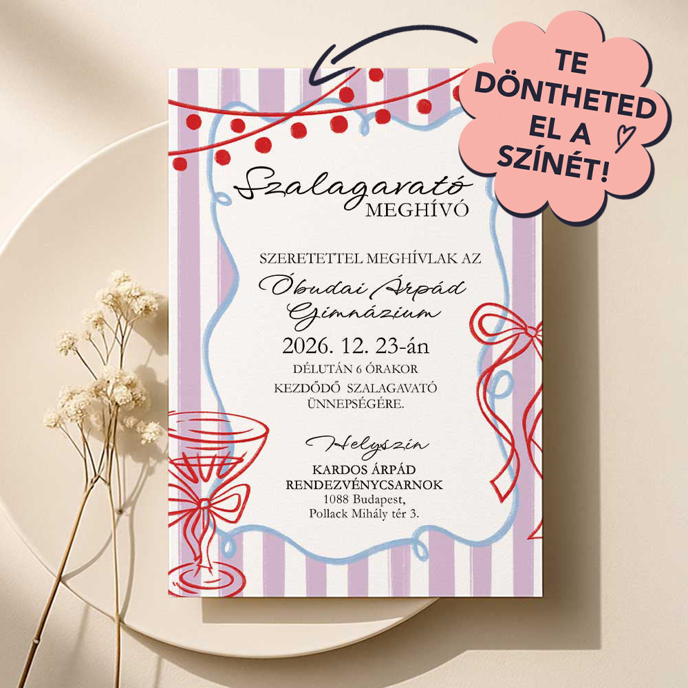 Fiatalos és bulis szalagavató meghívó csíkos dizájnnal. A meghívó minden elemének színét te választhatod ki, így teljesen személyre szabhatod. Modern, lendületes és vidám megjelenés, amely igazán egyedivé teszi a szalagavató meghívódat.